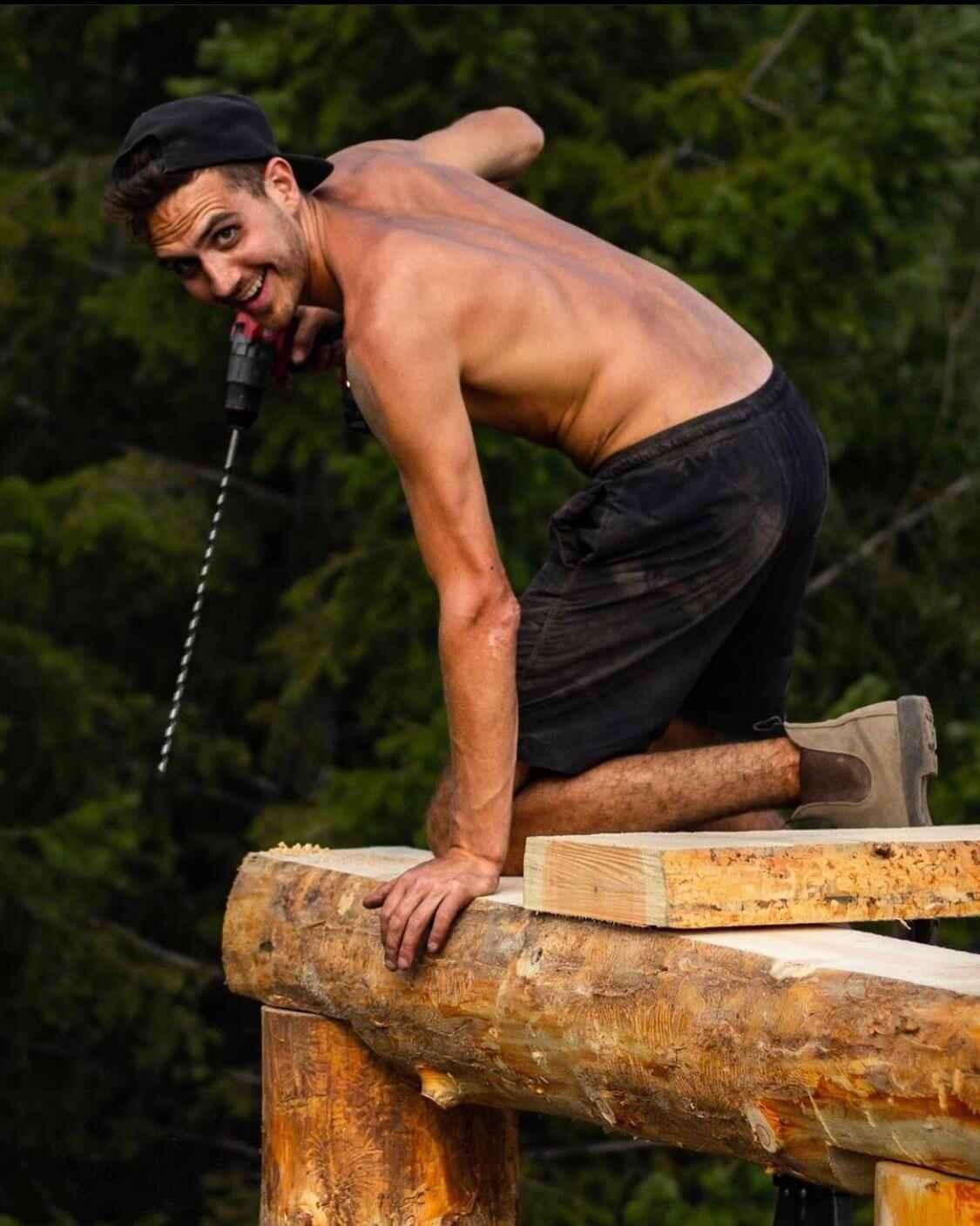 Shelby building an out-door shower tower out of logs for one of our spa areas.