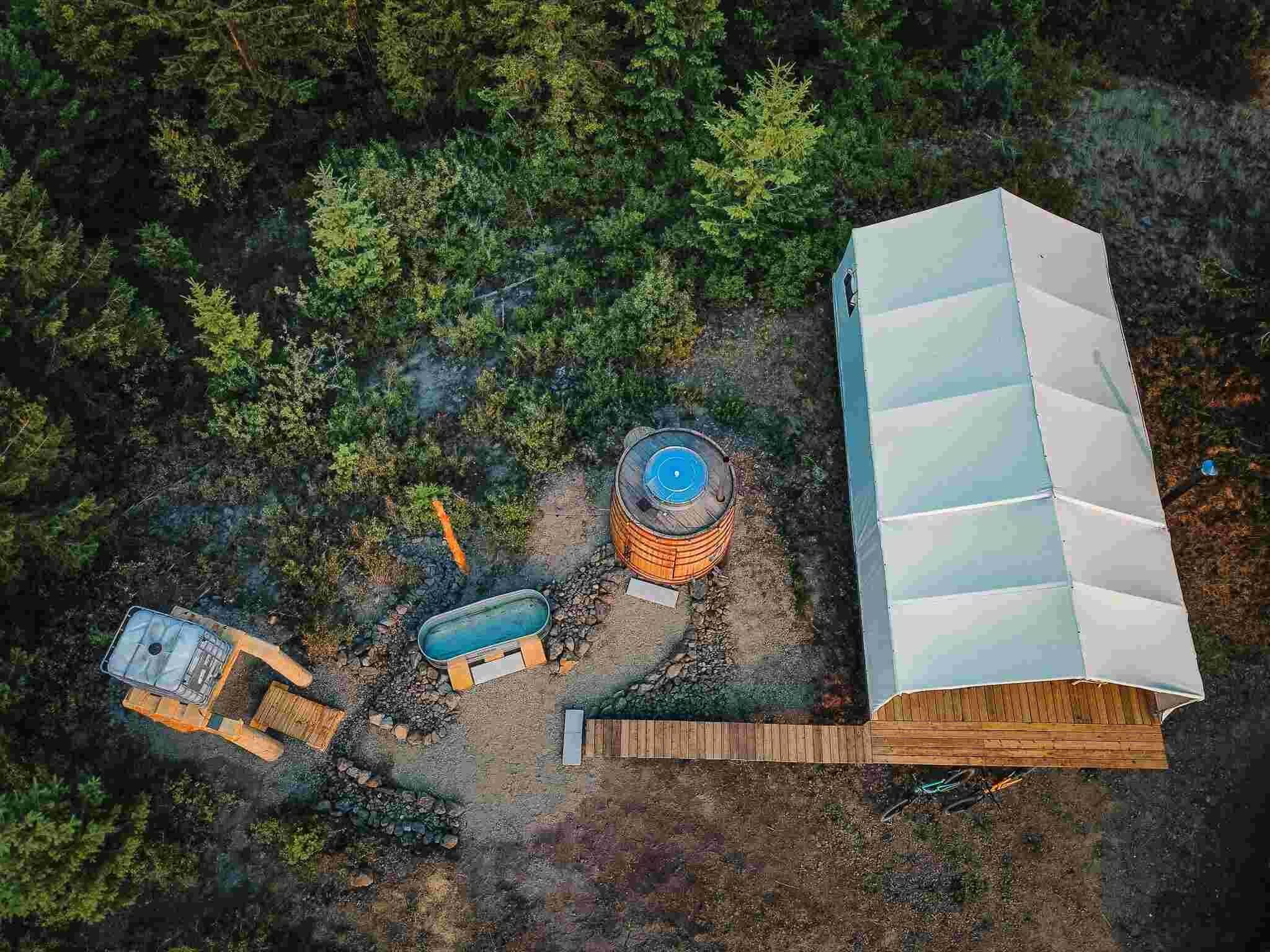 Shelby and our friend Jesse hanging out in our 10 person wood-fire hot tub with a view of our mountain